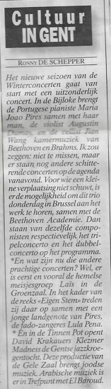 Maria Joao Pires (foto Governo De Sergipe via Wikipedia) in de Bijloke… Dit delen: Klik om te delen op Facebook (Opent in een nieuw venster) Facebook Klik om te delen op X (Opent in een nieuw venster) X Klik om dit te e-mailen naar een vriend (Opent in een nieuw venster) E-mail Klik om af te drukken (Opent in een nieuw venster) Print Meer Klik om op LinkedIn te delen (Opent in een nieuw venster) LinkedIn Klik om op Pinterest te delen (Opent in een nieuw venster) Pinterest Vind-ik-leuk Aan het laden...