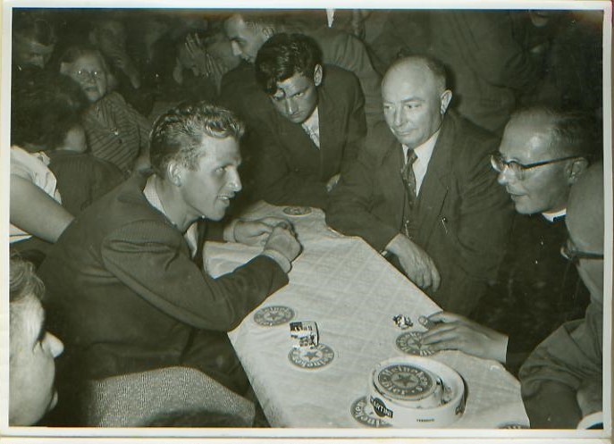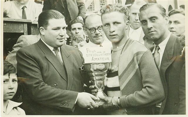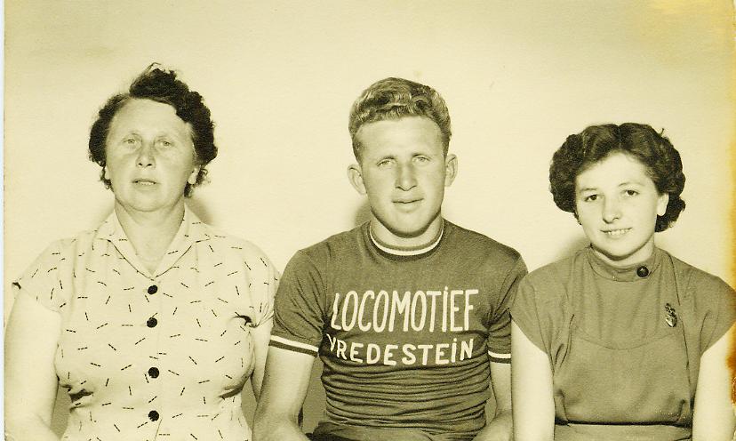 Het kan niet anders of ze worden daarna beroeps. Jaap in 1957 net iets eerder dan Pietje. Thuis laat Jaap zich vol trots – met een open blik naar de toekomst – vereeuwigen in een Magneet-shirt geflankeerd door verloofde Cissie Laemers. Én moeder Kersten. Die overigens vond dat één renner in de familie genoeg was. De rest van de boys moest maar met pa mee gaan stukadoren. Of naar de papierfabriek in Gennep. Er moest ook brood op de plank komen in huize Kersten. En als ze dan nog een beetje puf over hadden konden ze ’s zondags gaan voetballen bij Stormvogels ‘28. Wat Jaap overigens ook weer – langjarig – ging doen na zijn wielerloopbaan.