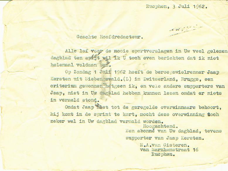 Na die grandioze overwinning werd Jaap natuurlijk feestelijk onthaald in het geboortedorp. Overal moest hij zijn verhaal doen. En alle hotemetoten, met pastoor voorop, waren een en al oor voor de verhalen over dat gigantische avontuur. Dezelfde pastoor, van wie Jaap, “Het Vrije Volk” niet mocht lezen. Zo plaagde althans Jan Liber, journalist van die “rooie” krant, Jaap in de Tour steevast met zijn Noord-Limburgse afkomst.