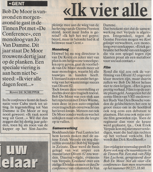 Bob De Moor viert alle dagen feest in zijn geliefde Gent (foto Nicholas Maeterlinck) Dit delen: Klik om te delen op Facebook (Opent in een nieuw venster) Facebook Klik om te delen op X (Opent in een nieuw venster) X Klik om dit te e-mailen naar een vriend (Opent in een nieuw venster) E-mail Klik om af te drukken (Opent in een nieuw venster) Print Meer Klik om op LinkedIn te delen (Opent in een nieuw venster) LinkedIn Klik om op Pinterest te delen (Opent in een nieuw venster) Pinterest Vind-ik-leuk Aan het laden...