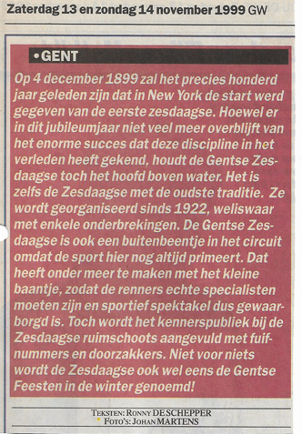 Hierna volgen enkele korte bijdragen over de Gentse zesdagen in 1999, telkens met foto’s van Johan Martens, maar voor het inleidend artikeltje had ik echter geen foto door hem genomen, daarom doe ik een beroep op zijn collega Nicholas Maeterlinck… Dit delen: Klik om te delen op Facebook (Opent in een nieuw venster) Facebook Klik om te delen op X (Opent in een nieuw venster) X Klik om dit te e-mailen naar een vriend (Opent in een nieuw venster) E-mail Klik om af te drukken (Opent in een nieuw venster) Print Meer Klik om op LinkedIn te delen (Opent in een nieuw venster) LinkedIn Klik om op Pinterest te delen (Opent in een nieuw venster) Pinterest Vind-ik-leuk Aan het laden...