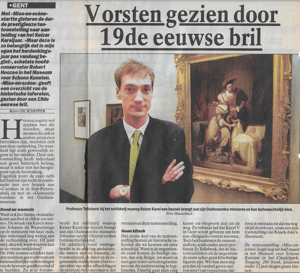 Professor Jo Tollebeek bij het schilderij waarop Keizer Karel een bezoek brengt aan zijn Oudenaardse minnares en hun buitenechtelijk kind (foto Nicholas Maeterlinck)