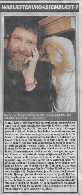 Marcel Ketels: eerst kerstliederen met zijn ensemble, nadien een opera met de school (foto Nicolas Maeterlinck) Dit delen: Klik om te delen op Facebook (Opent in een nieuw venster) Facebook Klik om te delen op X (Opent in een nieuw venster) X Klik om dit te e-mailen naar een vriend (Opent in een nieuw venster) E-mail Klik om af te drukken (Opent in een nieuw venster) Print Meer Klik om op LinkedIn te delen (Opent in een nieuw venster) LinkedIn Klik om op Pinterest te delen (Opent in een nieuw venster) Pinterest Vind-ik-leuk Aan het laden...