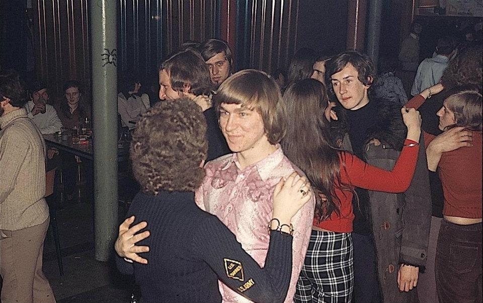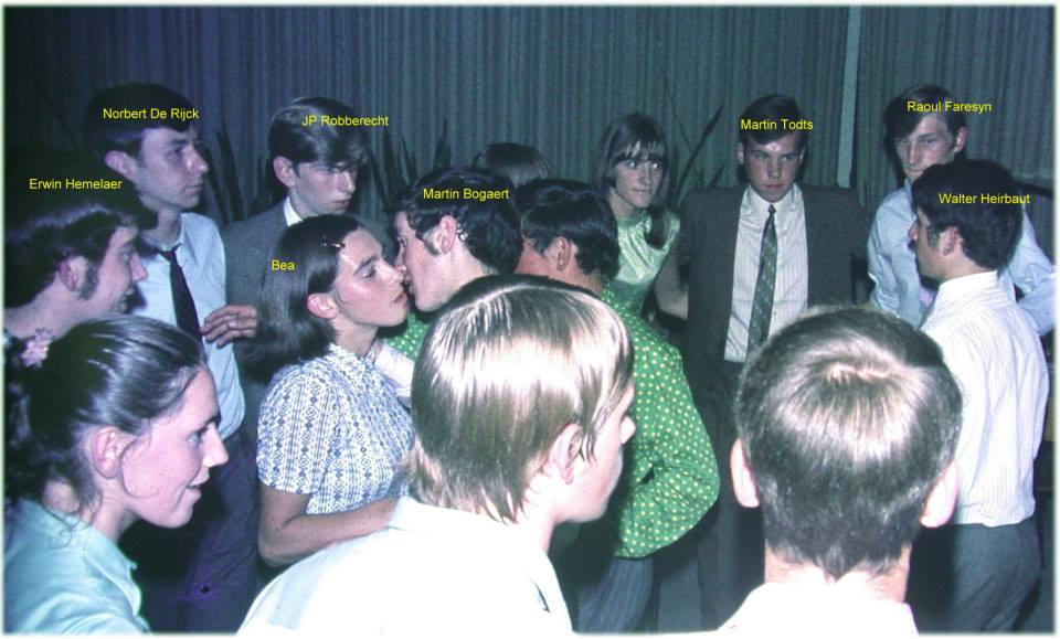 Zo’n ‘trage’ bood voordelen: gefluister (bevordert het gevoel en de sfeer van intimiteit), en de wel heel verraderlijke en aanlokkelijke nabijheid der lichamen. En de plaatsing van de handen – wat een subtiel spel kon dat worden! Die ene hand mocht dan nog op een schouder rusten, de andere bevond zich onvermijdelijk lager, met een beetje geluk en veel driestheid zelfs heel wat lager. Zo kon zij de bilpartij wel eens naderen. Volgt er geen protest, geen ongemakkelijk duwen… dan kan de andere hand bijgevoegd worden. Mogelijk – hopelijk volgt er nog een tweede trage song! laat dit goddelijke moment duren tot de eeuwigheid – dan durven de vingers het aan over te gaan tot voorzichtige strelingen. Dat alles onder de dekmantel van verminderde belichting, het was een ongeschreven wet om tijdens zo’n plakker het licht te dimmen. Heerlijke tijden! Dat waren de minuten van de geplette lijven, de hitsige seconden. De ogenblikken dat de geslachtsklieren opgepoetst werden… De hormonen vlogen door de zaal, tegen de muren op, kaatsten op het plafond – geen ontsnappen mogelijk. De goede zeden verdwenen naar waar ze hoorden. Dit was het hoogtepunt van het weekend. We hadden de week, de school achter ons gelaten, dat verfoeide lokaal dat een verzameling geslachtsloze individuen herbergde want gemengd onderwijs was nog veeleer een rariteit in onze contreien met overwegend deugdelijk christelijk geïnspireerd onderwijs.