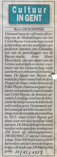 De vijftiende aflevering van de Mededelingen van het Cyriel Buysse Genootschap stond vooral in het teken van het overlijden van professor Antonin van Elslander, één van de grondleggers van de Buysse-studie. Anne Marie Musschoot, zijn opvolgster vaan de Gentse universiteit en tevens voorzitster van het Genootschap, wijdde aan hem een ontroerend in memoriam. (Foto Jo Clauwaert)