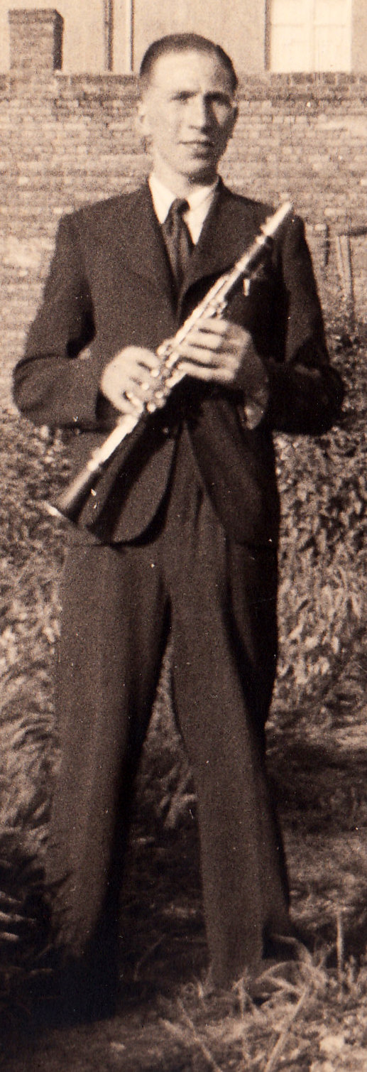 Die lessen notenleer, dat was dan wel een revisie van de lessen uit mijn jeugd. Op erg jonge leeftijd werd ik immers reeds naar de muziekschool gestuurd. Na drie jaar notenleer (zeer tegen mijn zin) moest ik, net als mijn vader (foto), klarinet studeren. Nog veel meer tegen mijn zin. Wellicht door zijn vele oefenen (uiteraard niet altijd vlekkeloos) had ik toen reeds een hekel aan het schrille geluid en zelf kon ik er lange tijd niets anders uithalen dan akelig gepiep en gejank. Het was zo erg dat een buurjongen aan de deur kwam luistervinken als tijdverdrijf.