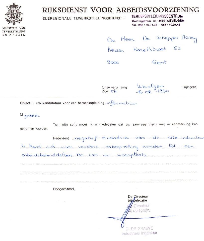 In het begin van de jaren negentig was een opleiding tot informaticus nog niet zo algemeen verspreid als nu. Bovendien had ik mezelf verbaasd door in de ingangsproef te slagen, want die was nogal erg wiskundig getint en dat is normaal gesproken niet zo “mijn ding”. Kortom, ik zag mezelf al een glorieuze toekomst tegemoet gaan in een “beroep met toekomst”, maar dat was buiten “de 1ste instructeur” gerekend. Dat was een soort van psycholoog die moest nagaan of je ook wel “psychologisch” geschikt was voor de job. Nee dus, oordeelde hij. “Het is duidelijk,” zei hij, “jouw roeping is schrijven en dus heb je hier eigenlijk niets te zoeken.” Toen ik hem erop wees dat ik al bij tal van dagbladen en tijdschriften had gesolliciteerd, maar dat mijn ervaring bij De Rode Vaan blijkbaar niet op prijs werd gesteld, antwoordde hij: “Luister, als ik jou erdoor zou laten, dan zou ik mezelf hier overbodig maken…” Ja, daar kon ik niets tegen inbrengen natuurlijk…