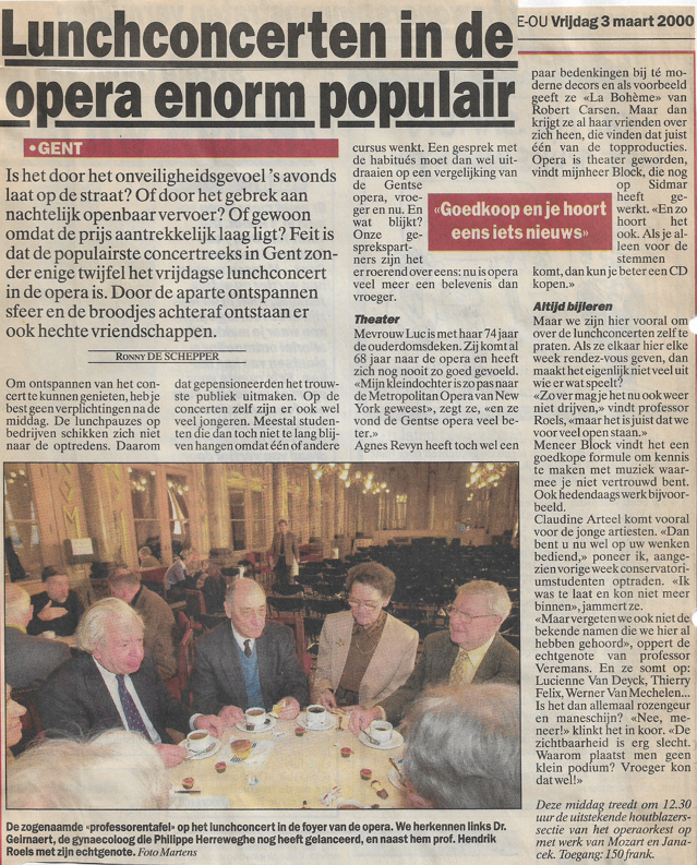 De zogenaamde “professorentafel” op het lunchconcert in de foyer van de opera. We herkennen links Dr.Geirnaert, de gynaecoloog die Philippe Herreweghe nog heeft gelanceerd, en naast hem prof.Hendrik Roels met zijn echtgenote (foto Johan Martens) Dit delen: Share op Facebook (Opent in een nieuw venster) Facebook Delen op X (Opent in een nieuw venster) X E-mail een link naar een vriend (Opent in een nieuw venster) E-mail Afdrukken (Opent in een nieuw venster) Print Meer Delen op LinkedIn (Opent in een nieuw venster) LinkedIn Delen op Pinterest (Opent in een nieuw venster) Pinterest Vind-ik-leuk Aan het laden...