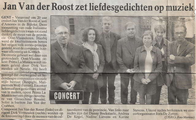 Componist Jan Van der Roost (links) en dirigent Dirk Vermeulen (rechts) worden omringd door de mensen van de cultuurdienst van de provincie. Van links naar rechts zijn dat Danny Bockstaele, Andrea De Kegel, Nadine Lievens en Karine Stevens. Uiterst rechts herkennen we concertorganisator Joris De Zutter. (foto Johan Martens)