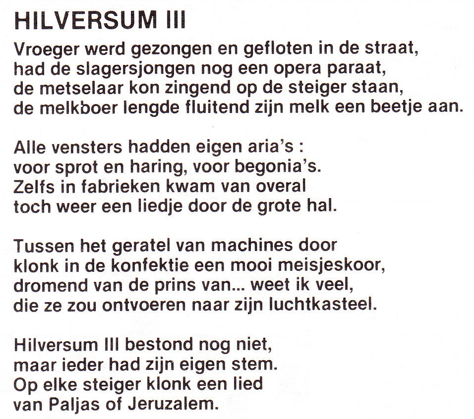 De tekst hiernaast plukten we dan weer uit een andere elpee van Herman Van Veen, die de titel « Signalen » meekreeg naar het lied dat door Van Veen en Wilmink werd geschreven voor « Een gebaar », de tweedaagse manifestatie ten gunste van Amnesty International in theater Carré (Amsterdam) op 16 en 17 mei van vorig jaar. We gaven echter de voorkeur aan deze tekst omdat — laten we eerlijk zijn — hij korter is, maar ook uit nostalgie naar een (op dat gebied althans) inderdaad goeie ouwe tijd, waar we vooral nu vaak aan terugdenken, nu we zelfs niet meer op BRT2 kunnen afstemmen vanwege de vermaledijde Radio 2, de vrije radio’s achterna. Diezelfde sfeer wordt trouwens ook nog opgeroepen in « Edith Piaf » en in « Een lichte vrouw », een lied dat overigens over de stad Amsterdam handelt. En misschien moeten we hier ook nog « Huurcontract » van Herman De Coninck bij rekenen, zij het dan enkel wegens « de regen van melancholie ».