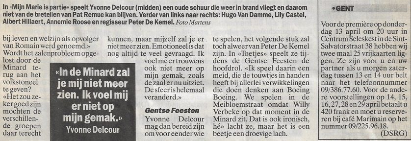 In “Mijn Marie is partie” speelt Yvonne Delcour (midden) een oude schuur die weer in brand vliegt en daarom niet van de bretellen van Pat Remue kan blijven. Verder van links naar rechts: Hugo Van Damme, Lily Castel, Albert Hillaert, Annemie Roose en regisseur Peter De Kemel. (Foto Johan Martens)