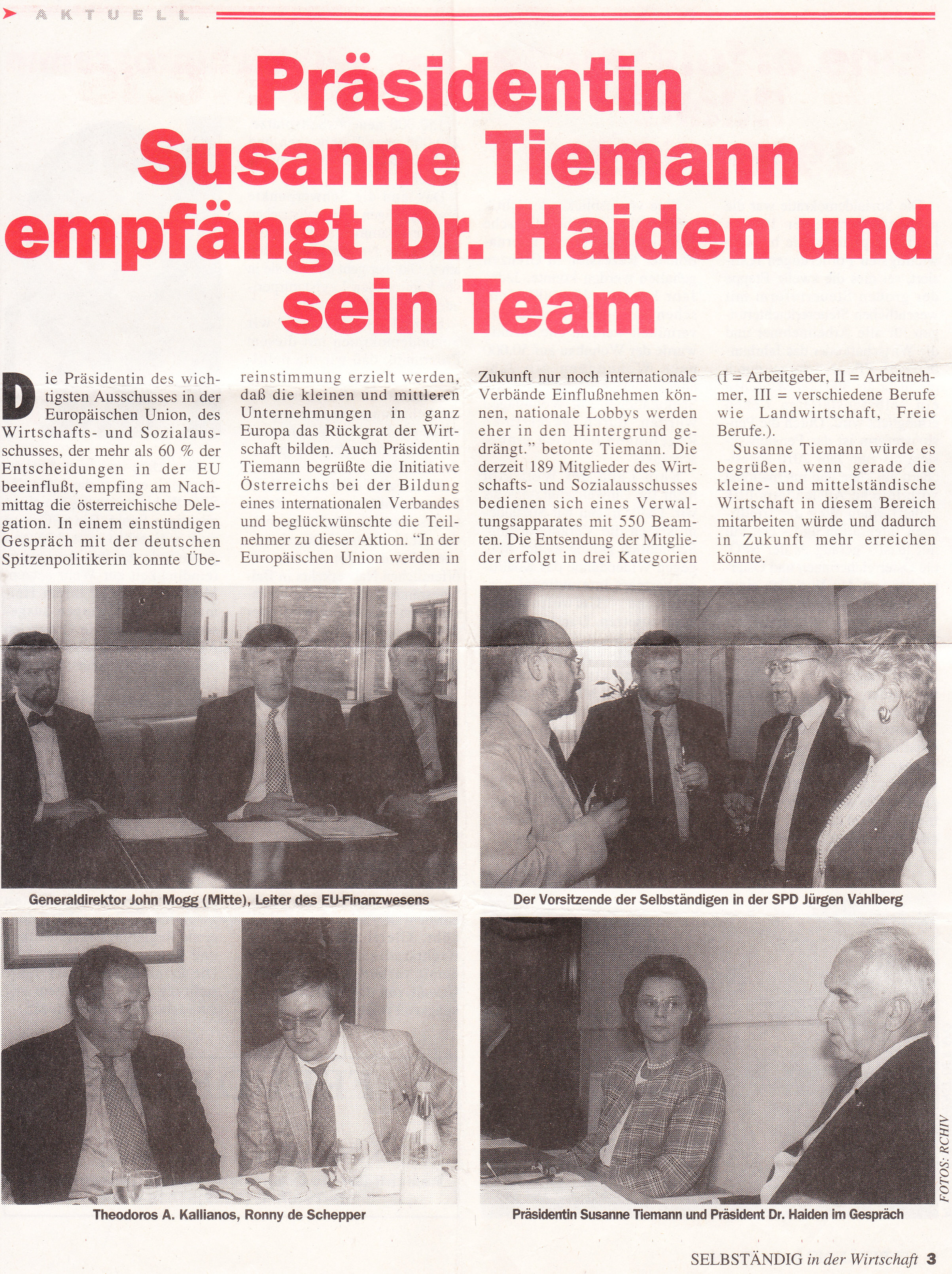 In een gesprek van een uur met de hoogste Duitse politica werd besloten dat kleine en middelgrote ondernemingen in heel Europa de ruggengraat van de economie vormen. Ook president Tiemann verwelkomde het initiatief van Oostenrijk om een internationale vereniging op te richten en feliciteerde de deelnemers met deze actie. “In de toekomst zullen alleen internationale verenigingen invloed kunnen uitoefenen in de Europese Unie, terwijl nationale lobby’s naar de achtergrond worden gedrongen,” benadrukte Tiemann. De huidige 189 leden van het Economisch en Sociaal Comité worden aangestuurd door 550 ambtenaren. De leden zijn ingedeeld in drie categorieën (I = werkgever, II = werknemer, III = diverse beroepen zoals landbouw, vrije beroepen).