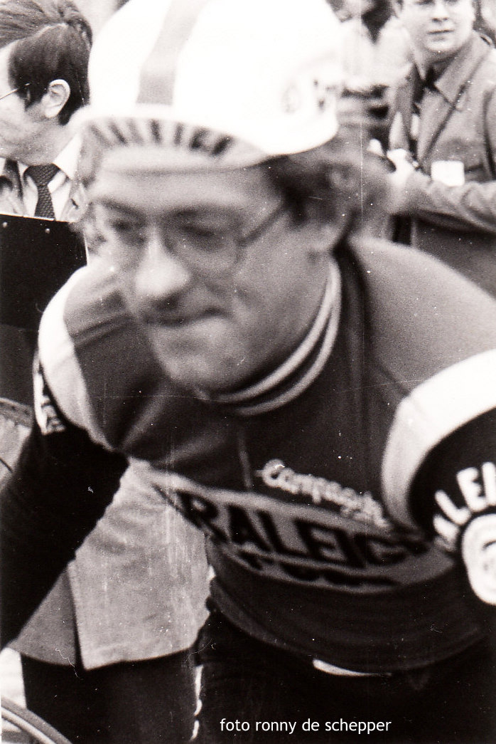 Alhoewel ik wel een paar foto’s van hem heb genomen (telkens bij de start van de Omloop Het Volk, hiernaast in 1978 en elders in zijn Europdecor-trui van 1984), heb ik hem nooit geïnterviewd. Ik heb wel een artikeltje geschreven in De Rode Vaan n.a.v. zijn overwinning in het wereldkampioenschap op de Nurbürgring (eveneens in 1978) en dat vindt u hieronder.