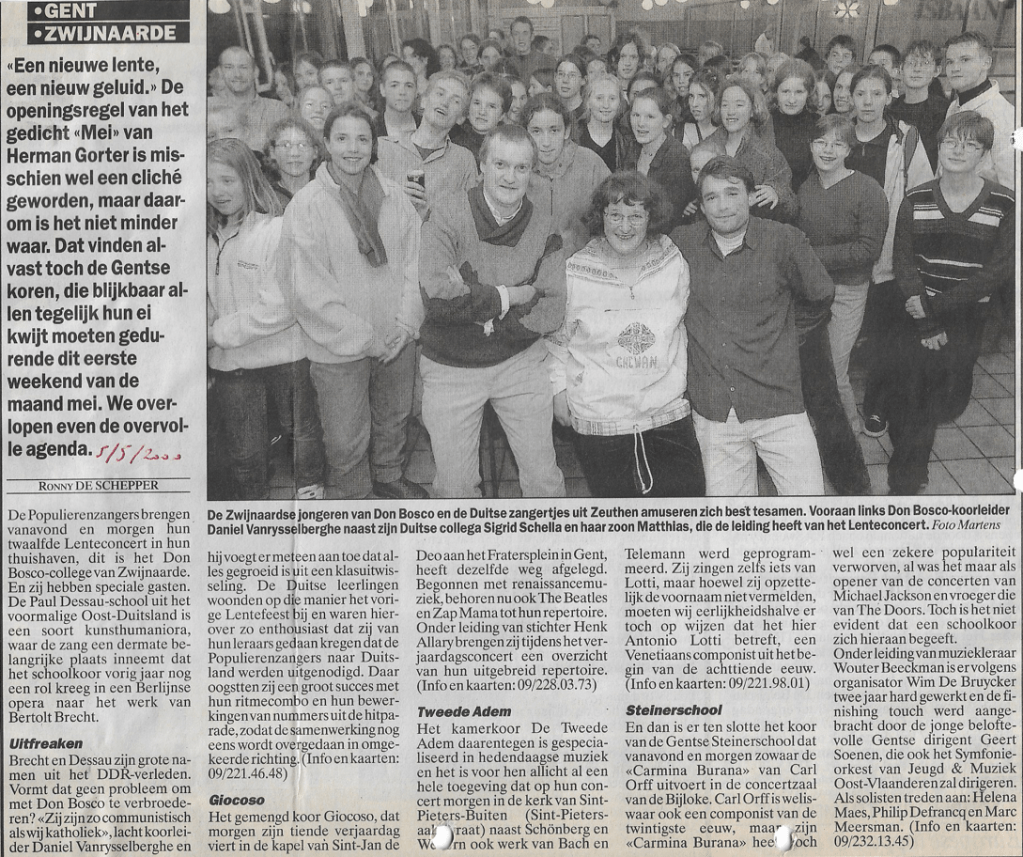 De Zwijnaardse jongeren van Don Bosco en de Duitse zangertjes uit Zeuthen amuseren zich best tesamen. Vooraan links Don Bosco-koorleider Daniel Vanrysselberghe naast zijn Duitse collega Sigrid Schella en haar zoon Matthias, die de leiding heeft van het Lenteconcert. (foto Johan Martens)