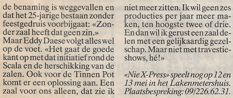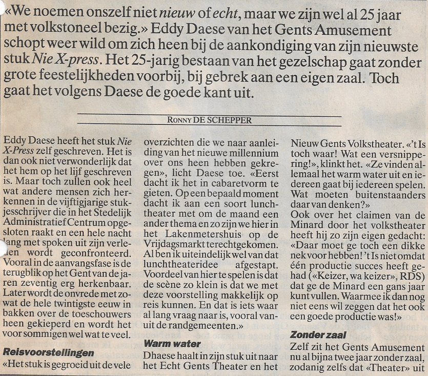 Eddy Daese met de spelers van het Gents Amusement in het decor van “Nie X-Press” (foto Johan Martens) Dit delen: Klik om te delen op Facebook (Opent in een nieuw venster) Facebook Klik om te delen op X (Opent in een nieuw venster) X Klik om dit te e-mailen naar een vriend (Opent in een nieuw venster) E-mail Klik om af te drukken (Opent in een nieuw venster) Print Meer Klik om op LinkedIn te delen (Opent in een nieuw venster) LinkedIn Klik om op Pinterest te delen (Opent in een nieuw venster) Pinterest Vind-ik-leuk Aan het laden...