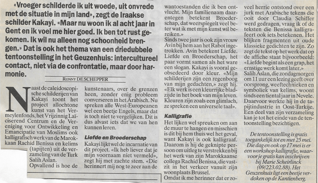 De Iraaks-Gentse kunstenaar Kakayi: “Schoonheid in plaats van woede” (foto Johan Martens) Dit delen: Klik om te delen op Facebook (Opent in een nieuw venster) Facebook Klik om te delen op X (Opent in een nieuw venster) X Klik om dit te e-mailen naar een vriend (Opent in een nieuw venster) E-mail Klik om af te drukken (Opent in een nieuw venster) Print Meer Klik om op LinkedIn te delen (Opent in een nieuw venster) LinkedIn Klik om op Pinterest te delen (Opent in een nieuw venster) Pinterest Vind-ik-leuk Aan het laden...