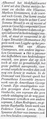 Sopraan Françoise Vanhecke, hier links op de foto van Facebook bij de viering van de 98ste verjaardag van actrice Alice Toen (met verder nog dichter Roel Richelieu Van Londersele en gitarist Juan del Granero, waarvan ik aanneem dat dit Jean Van der Schueren is?), zong twintig jaar geleden “madrigalen” van de Amerikaan George Crumb.