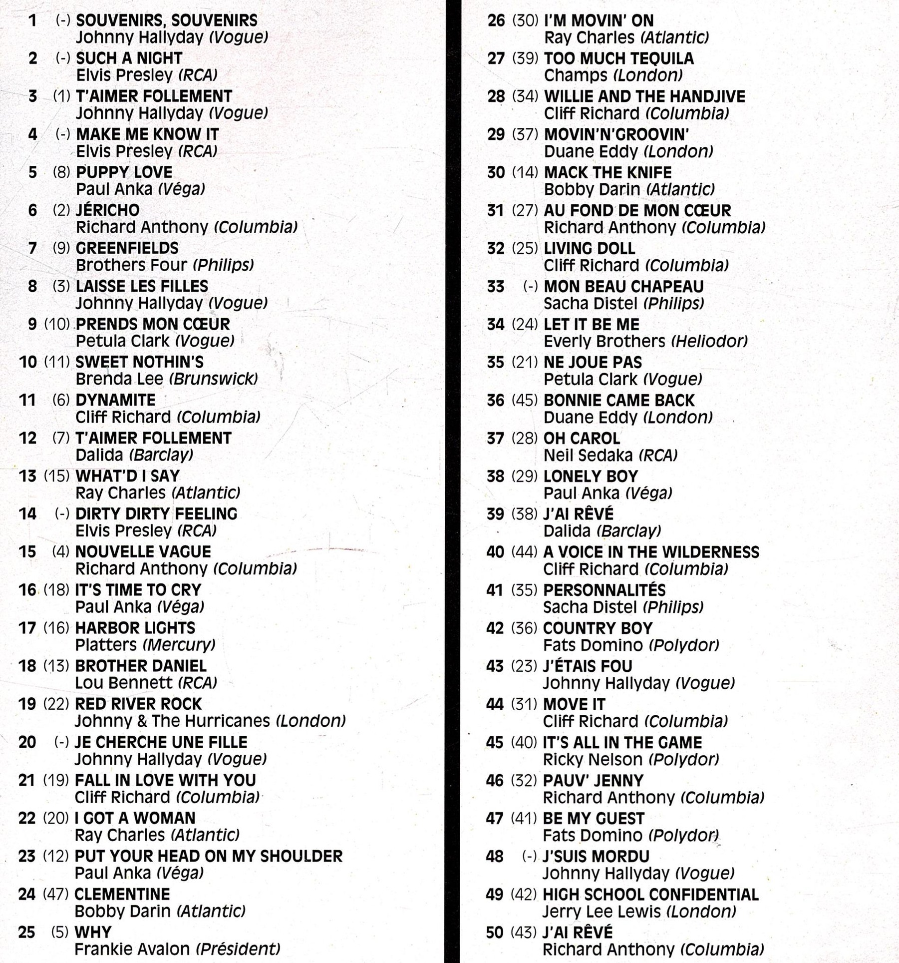 Dat 65 jaar geleden Johnny Hallyday de Franse hitlijst aanvoerde, is niet echt verwonderlijk. Wat me daarentegen wél verbaast, is het grote aantal Engelstalige nummers in die tijd! (met dank aan Patrick De Graeve) Dit delen: Klik om te delen op Facebook (Opent in een nieuw venster) Facebook Klik om te delen op X (Opent in een nieuw venster) X Klik om dit te e-mailen naar een vriend (Opent in een nieuw venster) E-mail Klik om af te drukken (Opent in een nieuw venster) Print Meer Klik om op LinkedIn te delen (Opent in een nieuw venster) LinkedIn Klik om op Pinterest te delen (Opent in een nieuw venster) Pinterest Vind-ik-leuk Aan het laden...