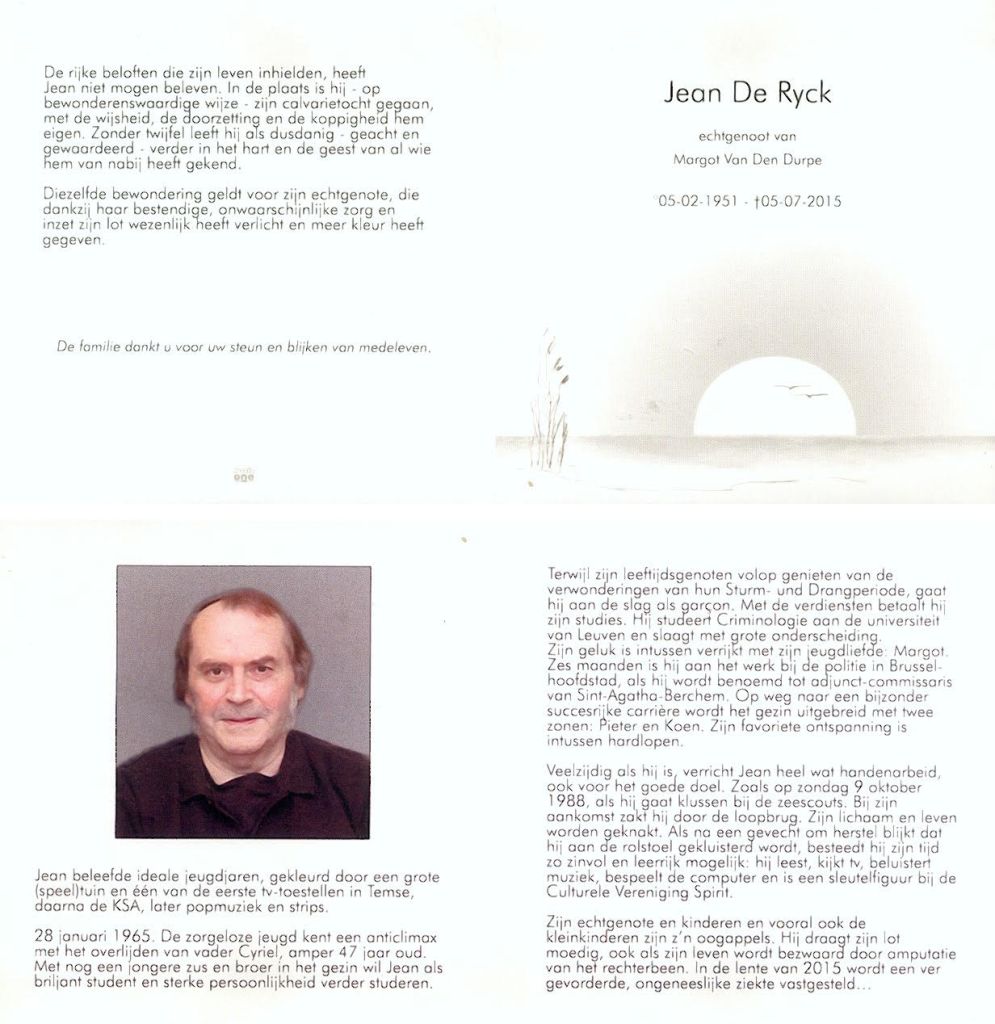 Jean De Ryck werd geboren in Bornem op 5 februari 1951 als 4de van de 6 kinderen van Cyriel De Ryck en Francine Steenssens. Zijn vader was werkzaam op de aankoopdienst van de Boelwerf.