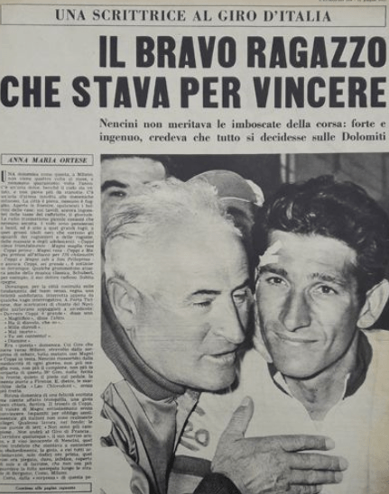 Vijf jaar geleden verraste Johan de Belie me met de mededeling dat hij een boek over de Giro d’Italia aan het lezen was. Daar moest ik het fijne van weten! Enigszins gealarmeerd, waarschuwde hij mij dat het niet enkel over de Giro ging. Het betrof “La lente scura” van de Italiaanse schrijfster Anna Maria Ortese dat in het Frans de misleidende titel “Tour d’Italie” had meegekregen. Misleidend, jazeker, maar toch ook weer niet helemaal ten onrechte (zie illustratie hieronder). Het gevolg was dat ik zo geïnteresseerd raakte dat ik mijn oude renfiets nog eens van stal haalde en richting Sint-Niklaas snelde om het kleinood ook eens door te nemen. Aangezien het een Franse uitgave betreft, verkoos ik oorspronkelijk de Franse Wikipedia-tekst boven de Engelse, maar die was wel verschrikkelijk uitgebreid. Gelukkig ontdekte ik op de valreep dat er ook nog een Nederlandse pagina bestaat (*)…