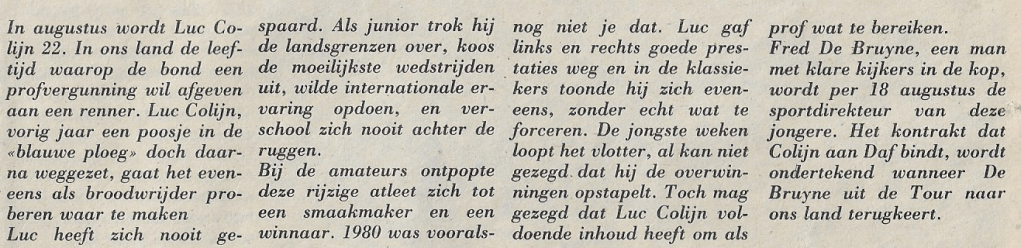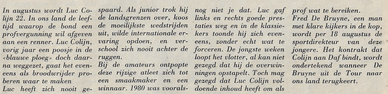 45 jaar geleden mocht Luc Colijn een profcontract tekenen bij Fred De Bruyne (foto Wim Dingemanse). Dit delen: Share op Facebook (Opent in een nieuw venster) Facebook Delen op X (Opent in een nieuw venster) X E-mail een link naar een vriend (Opent in een nieuw venster) E-mail Afdrukken (Opent in een nieuw venster) Print Meer Delen op LinkedIn (Opent in een nieuw venster) LinkedIn Delen op Pinterest (Opent in een nieuw venster) Pinterest Vind-ik-leuk Aan het laden...