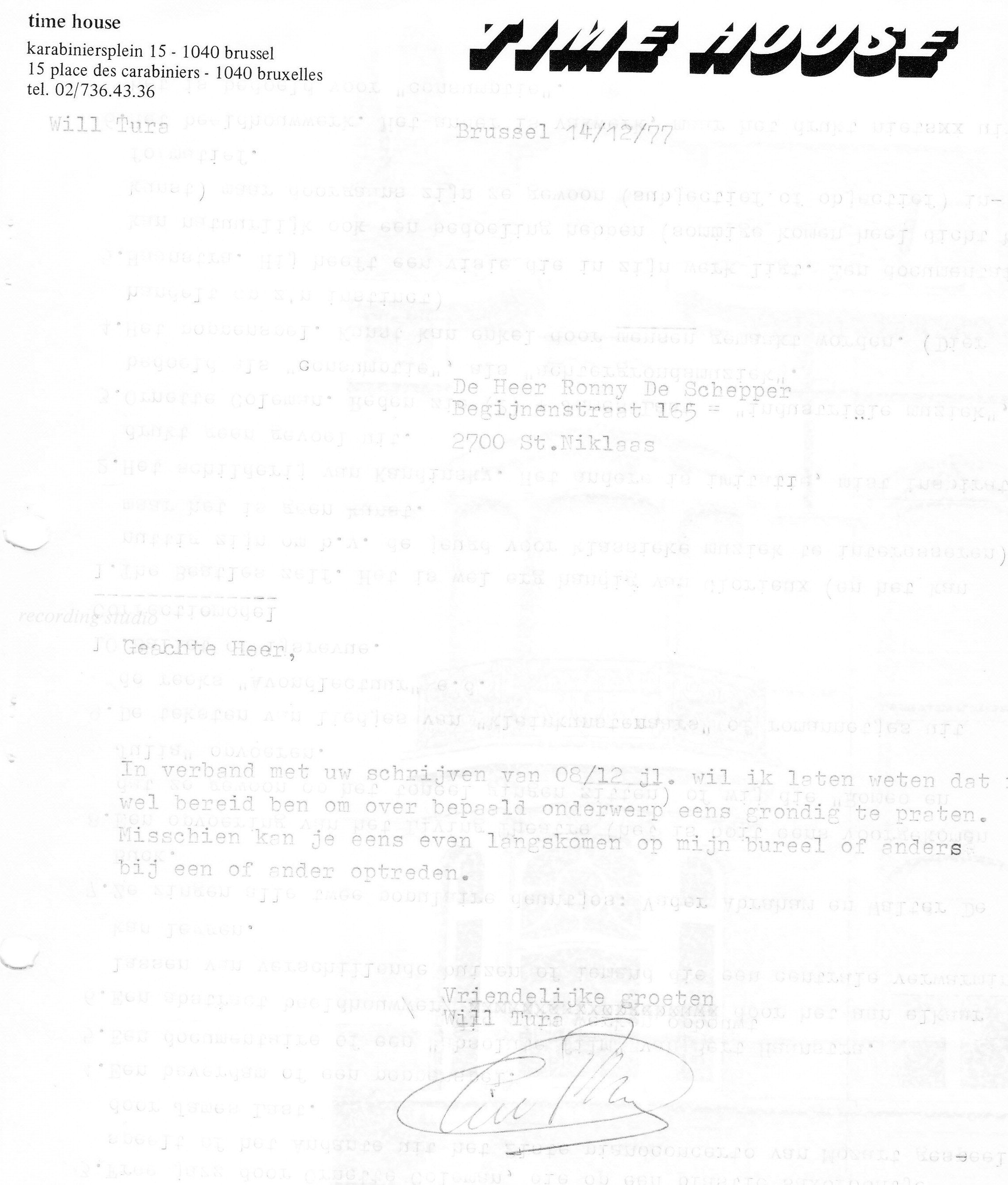 Blijkbaar had ik een paar jaar eerder (om precies te zijn in december 1977) reeds contact opgenomen met Will met het oog op een interview, zoals bijgaande brief bewijst, die ik totaal uit het oog was verloren, o.m. omdat ik de keerzijde had gebruikt voor andere doeleinden (hoe oneerbiedig van mij!). Dat de tekst echter zo goed als onleesbaar is, is dan weer niét mijn fout, Will (of op z’n minst zijn secretaresse) had zich eens een nieuw lint moeten aanschaffen! (Ja, beste lezertjes, er was een tijd dat brieven nog op een schrijfmachine met lint werden getikt en niet gewoon uit een printer rolden.)