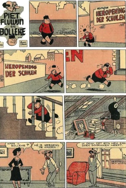 Uit mijn jeugd herinner ik mij een paginastrip van Piet Fluwijn en Bolleke die ongeveer als volgt ging. Bolleke loopt opgewekt door de straat, het is zomer, het zonnetje schijnt, nothing can go wrong. Tot hij plotseling heel erg schrikt. Hij slaat een blokje om, maar ook hier schrikt hij zich weer een hoedje. Nu begint hij te rennen. Weer een hoek om, maar… alweer slaat het noodlot toe! Deze keer neemt hij geen risico meer. Hij rent het huis binnen en staat uitgeput uit te hijgen tegen de deur. En dan, in de laatste prent, toont de tekenaar ons wat Bolleke zo aan het schrikken maakte: overal hingen er opschriften in de trant van “binnenkort heropening van de scholen”.