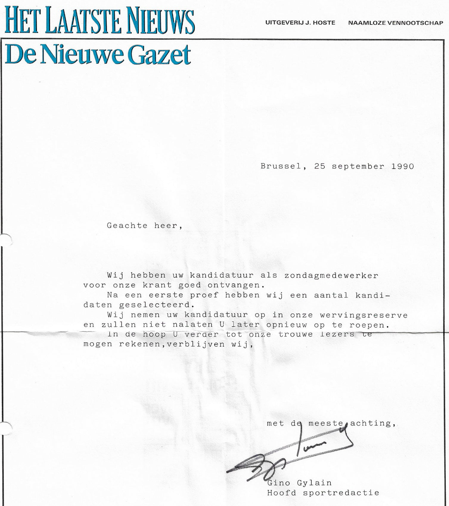 Zoals u kunt zien, werd ik 35 jaar geleden opgenomen in de “wervingsreserve” voor zondagmedewerkers van Het Laatste Nieuws. Uiteraard stelde dat niks voor en het heeft dan ook tot niets geleid. Dat ik later als stadsmedewerker op de Gentse redactie van Het Laatste Nieuws ben aan de slag gegaan, heeft hier niets mee te maken. En uiteraard ook niet met het feit dat ik nog “zondagmedewerker” ben geweest op de sportredactie van De Morgen, ook al bestond mijn taak er toen in om met name artikels uit Het Laatste Nieuws te bewerken…