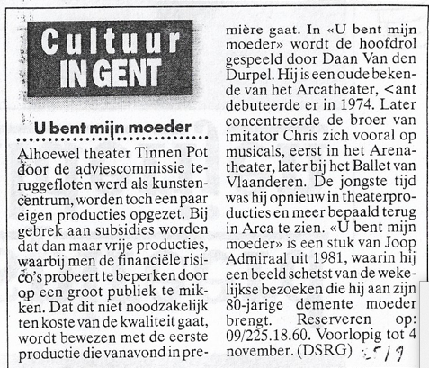 25 jaar geleden: Daan Van den Durpel in “U bent mijn moeder” van Joop Admiraal… Dit delen: Klik om te delen op Facebook (Opent in een nieuw venster) Facebook Klik om te delen op X (Opent in een nieuw venster) X Klik om dit te e-mailen naar een vriend (Opent in een nieuw venster) E-mail Klik om af te drukken (Opent in een nieuw venster) Print Meer Klik om op LinkedIn te delen (Opent in een nieuw venster) LinkedIn Klik om op Pinterest te delen (Opent in een nieuw venster) Pinterest Vind-ik-leuk Aan het laden...