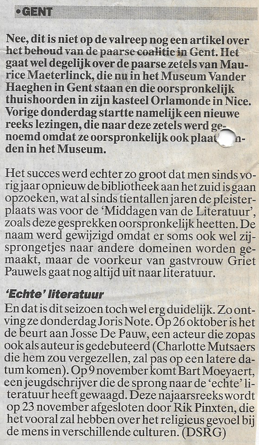 Voor het gesprek met Joris Note in de (nep)paarse zetels in de bibliotheek kwamen een zeventigtal belangstellenden opdagen, meestal vrouwen en wat Koot en Bie “oudere jongeren” noemen (foto Joost De Bock) Dit delen: Klik om te delen op Facebook (Opent in een nieuw venster) Facebook Klik om te delen op X (Opent in een nieuw venster) X Klik om dit te e-mailen naar een vriend (Opent in een nieuw venster) E-mail Klik om af te drukken (Opent in een nieuw venster) Print Meer Klik om op LinkedIn te delen (Opent in een nieuw venster) LinkedIn Klik om op Pinterest te delen (Opent in een nieuw venster) Pinterest Vind-ik-leuk Aan het laden...