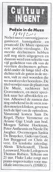 Poëzie in de Muze (foto nicelocal.be) Dit delen: Klik om te delen op Facebook (Opent in een nieuw venster) Facebook Klik om te delen op X (Opent in een nieuw venster) X Klik om dit te e-mailen naar een vriend (Opent in een nieuw venster) E-mail Klik om af te drukken (Opent in een nieuw venster) Print Meer Klik om op LinkedIn te delen (Opent in een nieuw venster) LinkedIn Klik om op Pinterest te delen (Opent in een nieuw venster) Pinterest Vind-ik-leuk Aan het laden...