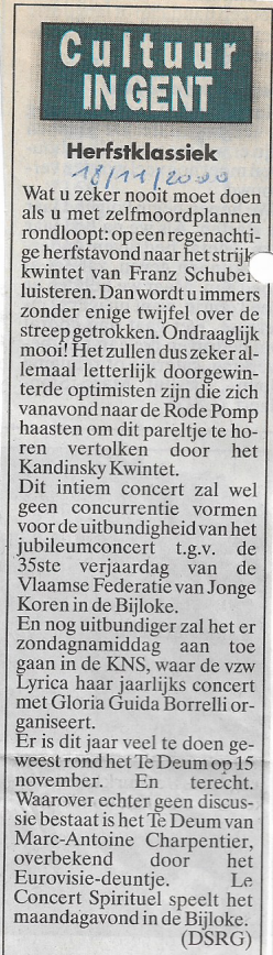 Het strijkkwintet van Schubert op een regenachtig herfstavond… Dit delen: Klik om te delen op Facebook (Opent in een nieuw venster) Facebook Klik om te delen op X (Opent in een nieuw venster) X Klik om dit te e-mailen naar een vriend (Opent in een nieuw venster) E-mail Klik om af te drukken (Opent in een nieuw venster) Print Meer Klik om op LinkedIn te delen (Opent in een nieuw venster) LinkedIn Klik om op Pinterest te delen (Opent in een nieuw venster) Pinterest Vind-ik-leuk Aan het laden...