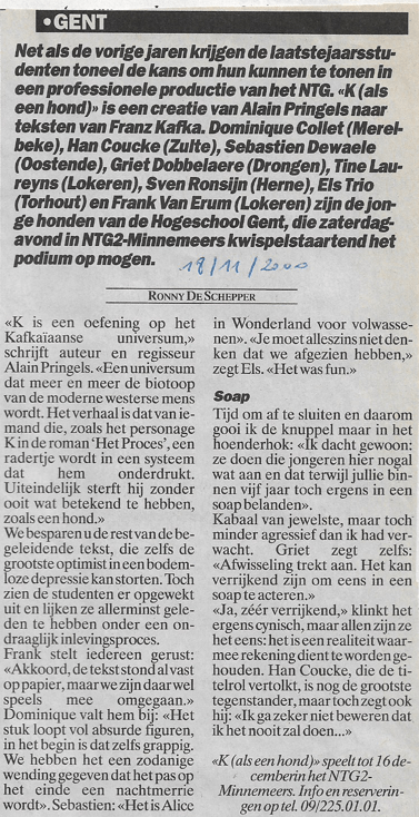 De studenten toneel die in het NTG spelen: op de voorgrond (v.l.n.r.) Griet Dobbelaere, Dominique Collet en Sven Ronsijn, op de tweede rij Frank Van Erum, Els Trio, Han Coucke, Sebastien Dewaele en Tine Laureys (foto Johan Martens) Dit delen: Klik om te delen op Facebook (Opent in een nieuw venster) Facebook Klik om te delen op X (Opent in een nieuw venster) X Klik om dit te e-mailen naar een vriend (Opent in een nieuw venster) E-mail Klik om af te drukken (Opent in een nieuw venster) Print Meer Klik om op LinkedIn te delen (Opent in een nieuw venster) LinkedIn Klik om op Pinterest te delen (Opent in een nieuw venster) Pinterest Vind-ik-leuk Aan het laden...