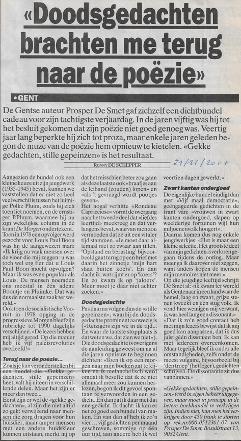 Prosper De Smet oftewel P.Pluym: “Zichzelf relativeren is beter dan een dikke nek hebben.” (foto Joost De Bock) Dit delen: Klik om te delen op Facebook (Opent in een nieuw venster) Facebook Klik om te delen op X (Opent in een nieuw venster) X Klik om dit te e-mailen naar een vriend (Opent in een nieuw venster) E-mail Klik om af te drukken (Opent in een nieuw venster) Print Meer Klik om op LinkedIn te delen (Opent in een nieuw venster) LinkedIn Klik om op Pinterest te delen (Opent in een nieuw venster) Pinterest Vind-ik-leuk Aan het laden...