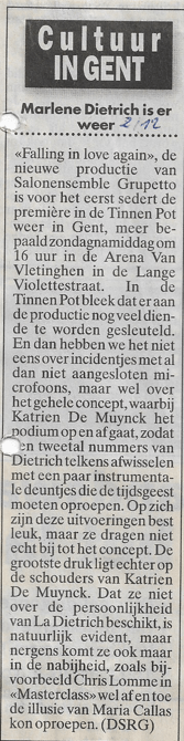 Marlene Dietrich is er weer in de persoon van Katrien De Muynck (foto Johan Martens) Dit delen: Klik om te delen op Facebook (Opent in een nieuw venster) Facebook Klik om te delen op X (Opent in een nieuw venster) X Klik om dit te e-mailen naar een vriend (Opent in een nieuw venster) E-mail Klik om af te drukken (Opent in een nieuw venster) Print Meer Klik om op LinkedIn te delen (Opent in een nieuw venster) LinkedIn Klik om op Pinterest te delen (Opent in een nieuw venster) Pinterest Vind-ik-leuk Aan het laden...