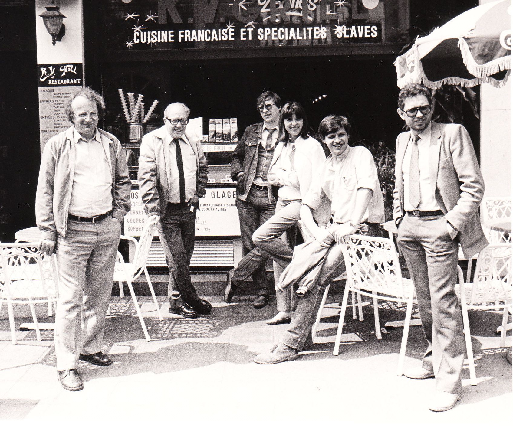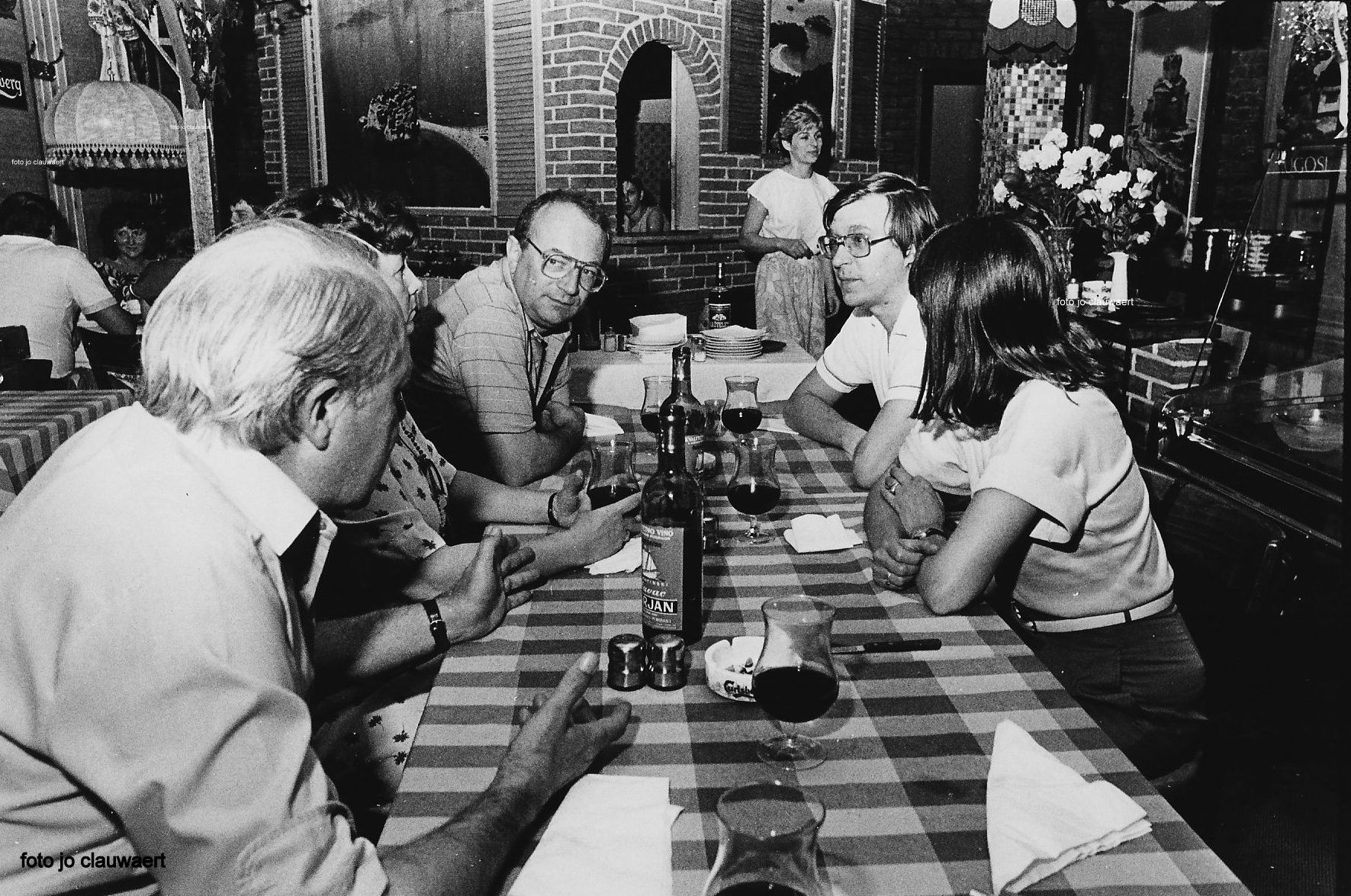 Alhoewel het er op zich niks mee te maken heeft, wil ik hier toch twee foto’s plaatsen van (een deel van) de redactie van De Rode Vaan voor de deur van en in een Joegoslavisch restaurant op de Lemonnierlaan, waar wij meestal naartoe gingen als er iets te vieren viel. En nee, ik leerde er geen slivovitsj drinken, want ik hou daar eigenlijk niet van. De vrouwen kregen op zo’n moment een zoet sinaasappellikeurtje voorgezet en dàt lustte ik dan weer wel. Maar hoe heette dat spul nu ook alweer???