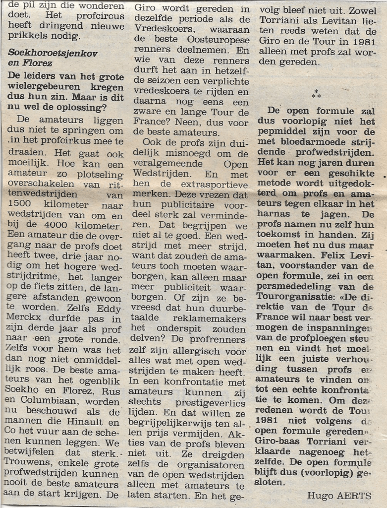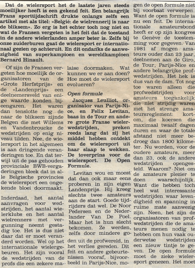45 jaar geleden waren er grote moeilijkheden in de internationale wielersport. Hugo Aerts schreef daarover een artikel in “De Voorpost” onder de titel: “Wie is nog voor de open formule?” Foto: Sergei Soekhoroetsjenkov (Instagram) Dit delen: Share op Facebook (Opent in een nieuw venster) Facebook Delen op X (Opent in een nieuw venster) X E-mail een link naar een vriend (Opent in een nieuw venster) E-mail Afdrukken (Opent in een nieuw venster) Print Meer Delen op LinkedIn (Opent in een nieuw venster) LinkedIn Delen op Pinterest (Opent in een nieuw venster) Pinterest Vind-ik-leuk Aan het laden...