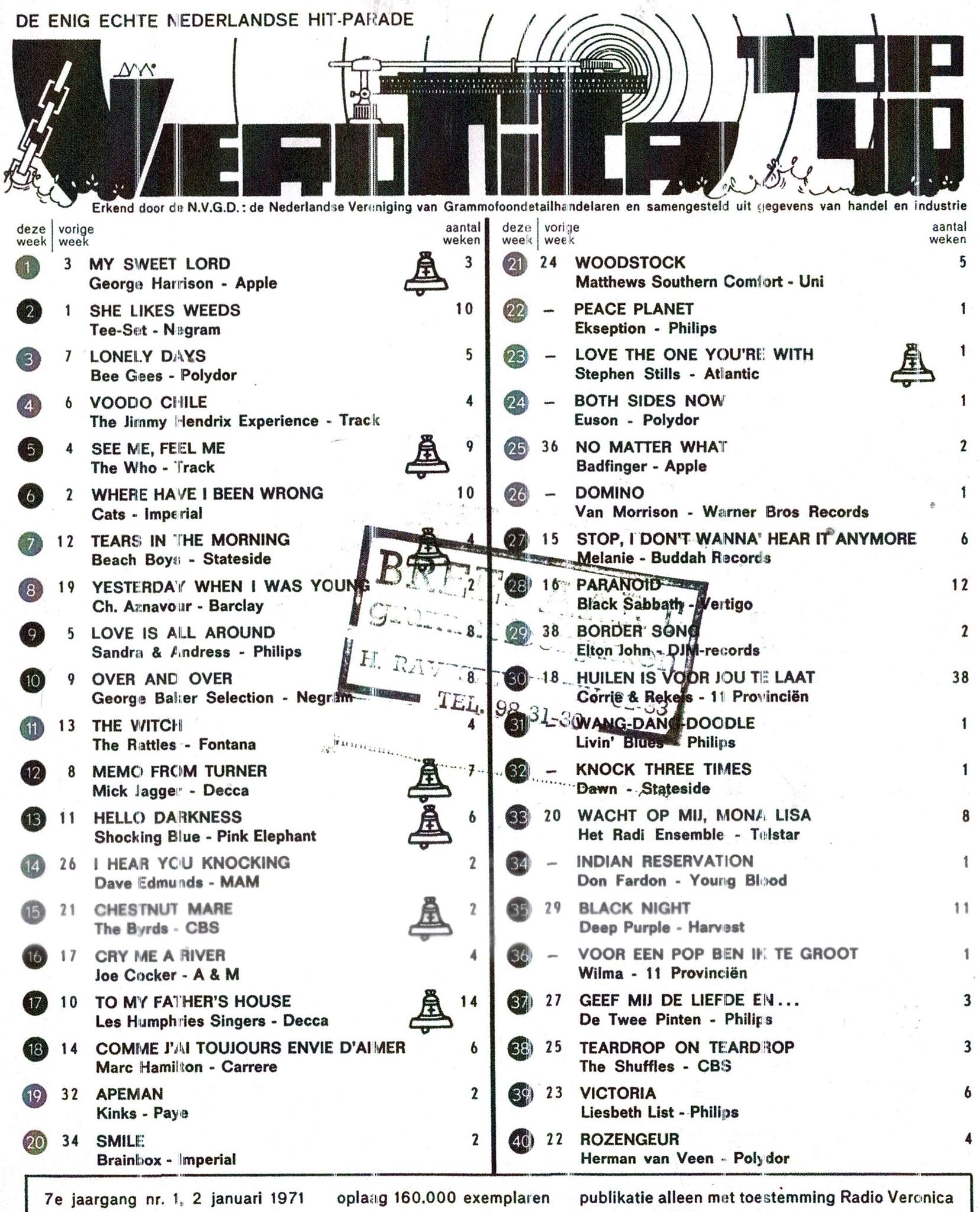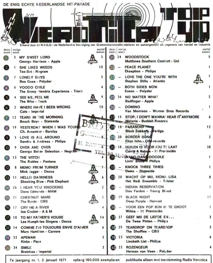 55 jaar geleden stond “My Sweet Lord” van George Harrison op nr.1 in de top veertig van Radio Veronica (met dank aan Patrick De Graeve).