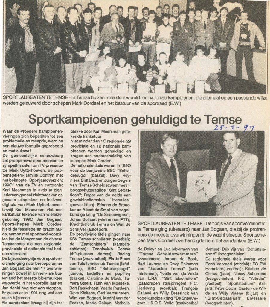 In Temse huizen meerdere wereld- en nationale kampioenen, die allemaal op een passende wijze werden gelauwerd door schepen Mark Cordeel en het bestuur van de sportraad (foto E.W.). Dit delen: Share op Facebook (Opent in een nieuw venster) Facebook Delen op X (Opent in een nieuw venster) X E-mail een link naar een vriend (Opent in een nieuw venster) E-mail Afdrukken (Opent in een nieuw venster) Print Meer Delen op LinkedIn (Opent in een nieuw venster) LinkedIn Delen op Pinterest (Opent in een nieuw venster) Pinterest Vind-ik-leuk Aan het laden...