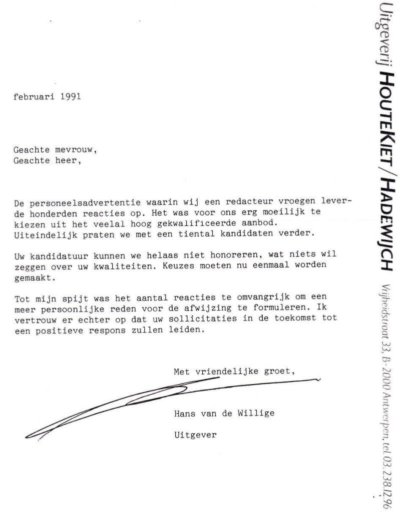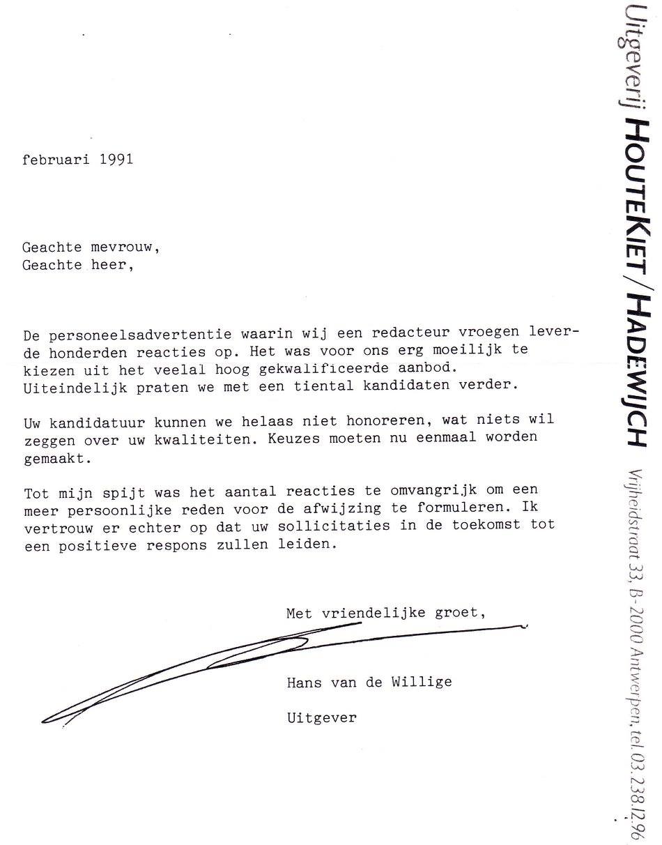 35 jaar geleden werd ik niet weerhouden als redacteur bij uitgeverij Houtekiet. Dit delen: Share op Facebook (Opent in een nieuw venster) Facebook Delen op X (Opent in een nieuw venster) X E-mail een link naar een vriend (Opent in een nieuw venster) E-mail Afdrukken (Opent in een nieuw venster) Print Meer Delen op LinkedIn (Opent in een nieuw venster) LinkedIn Delen op Pinterest (Opent in een nieuw venster) Pinterest Vind-ik-leuk Aan het laden...