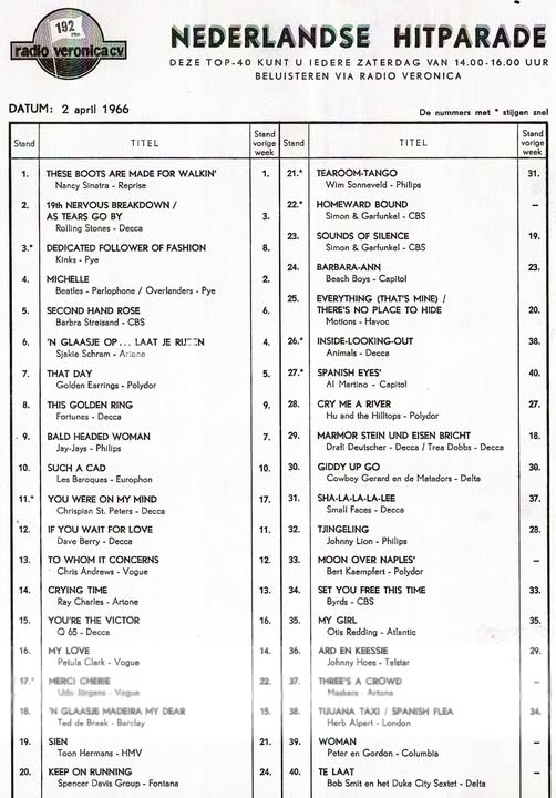 Zestig jaar geleden stond “These booths are made for walking” van Nancy Sinatra op nr.1 van de top veertig van Radio Veronica. Ook in Vlaanderen zou het door de verkoopcijfers op één prijken en ik ben fier dat ik daar mijn kleine bijdrage heb voor geleverd, want ook ik heb mij dit singeltje destijds aangeschaft. (Helaas weer zonder bijhorend hoesje!) Ik herinner me vooral de outro die door een dj van Veronica werd geparafraseerd als: “1-9-2, een goed idee”…