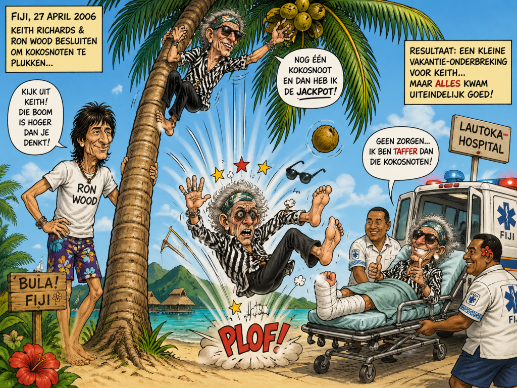 Tijdens hun vakantie op het eiland Fiji besluiten Keith Richard en Ron Wood op 27 april 2006 om in een palmboom te klimmen om kokosnoten te plukken. Keith Richard, de dan 62-jarige gitarist van The Rolling Stones valt echter uit de boom, en dient ter verzorging te worden overgebracht naar een ziekenhuis.